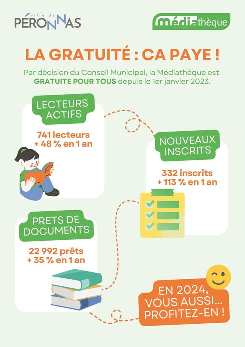 Depuis la décision du Conseil Municipal d'établir, depuis le 1er janvier 2023, la gratuité de la Médiathèque pour tous, le nombre de lecteurs ne cesse de croître !