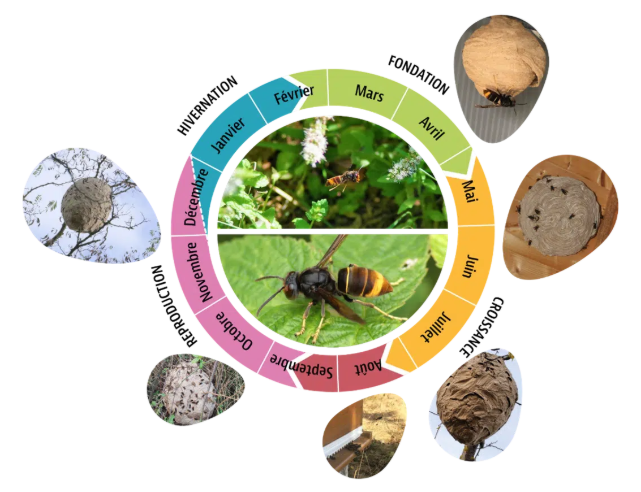 Cycle de vie annuel du frelon asiatique en 4 phases