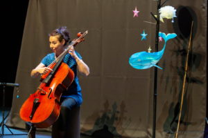 "Parfois dans leur lit, les bambins ne dorment pas. Ils suivent la baleine Brunette dans sa bulle bleutée… Ensemble ils s’envolent allumer les étoiles, pêcher les nuages et dessiner leurs rêves."